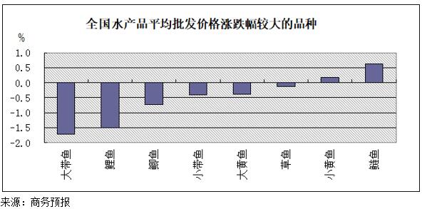 央视网消息:记者从商务部商务预报获悉,上周(8月27日至9月2日)商务部重点监测的全国36个大中城市水产品价格比前一周下降0.5%。其中,大带鱼、鲤鱼和鲫鱼等价格降幅居前,分别下降1.7%、1.5%和0.7%。全国大部分海域结束休渔,加之淡水鱼进入养殖收获期,水产品市场供应增加,预计后期水产品价格以震荡下行为主。