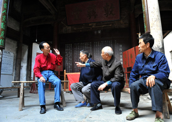 这是陈文华在与村里的长者商量合作社工作(4月28日摄)。