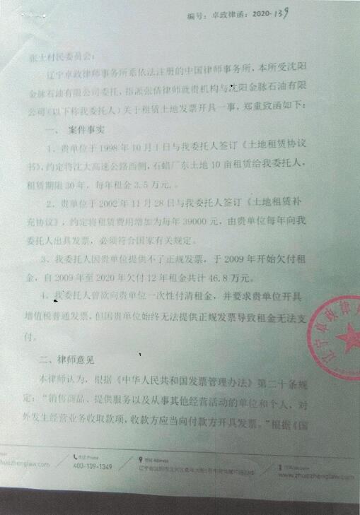 2020年上半年,辽宁卓政律师事务所受沈阳蜡化总厂、沈阳金脉石油有限公司委托,给张士村民委员会发来律师函(卓政律函2020-139),称拖欠村委会十余年租金的直接原因是因为张士村民委员会不能提供正规发票。这个理由既没有法律依据,又没有合同约定。这根本不像是一个律师事务所发出的东西,真是厚颜无耻至极!