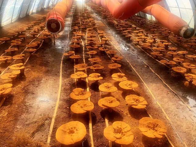 “不可思议”,“眼界大开”。暗棕色似花伞般的菌盖“池塘”,上面“住”满了棕褐色孢子粉,“伞盖”下住着“神气十足”的无数小林蛙……8月30日,记者跟随黑龙江省农业农村厅中药材发展处处长修国辉一行来到大庆市肇州县双发乡现代中医农业重要结合特医食品生产基地,走进灵芝和林蛙种养示范大棚,记者便被一株株长势喜人的灵芝和一只只活蹦乱跳、皮肤光滑的林蛙深深吸引、不由啧啧赞叹。悬挂在大棚内似红色长龙般的风机呼呼作响,它们正在采收漂浮在空中、肉眼根本无法看见的孢子粉。目前,正值采粉期,据初步估算,一栋大棚三天时间,约可吸出来4-5斤孢子粉,效益十分可观,已是全省独角兽产业,成为拉动全省大健康产业发展的一支劲旅。